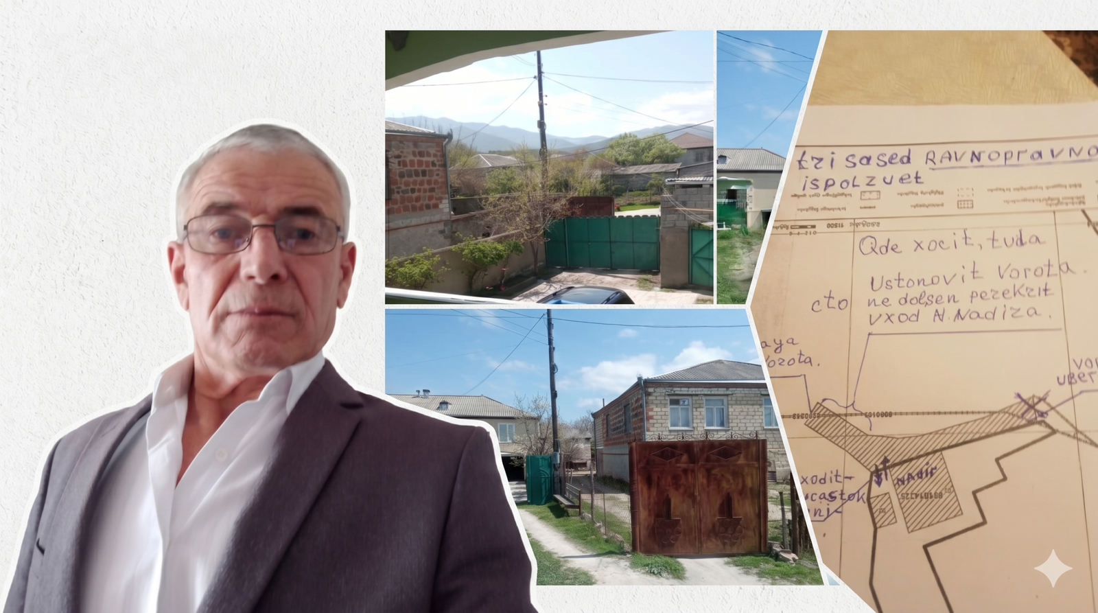 „ჩვენ ოდითგანვე გვქონდა საერთო გზა, რომელიც არავის ეკუთვნოდა. მეზობლებმა, მუნიციპალიტეტისა და რეესტრის ხელშეწყობით, გააყალბეს ნახაზი და მიითვისეს საერთო ფართობი. სიყალბე რეესტრიდან გამოთხოვილი დოკუმენტებით დავადასტურეთ“, — აცხადებს ნადირ ნაზაროვი.